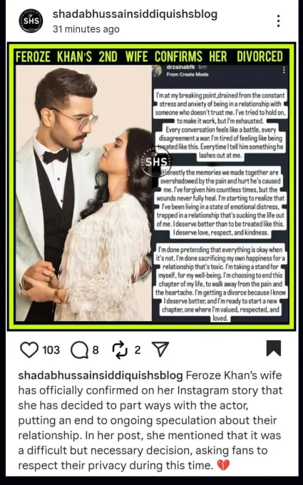 The screenshot shared by these pages appeared to show a message written by Zainab Feroze saying she had decided to get a divorce. The fake post claimed that she was stuck in a painful relationship that was affecting her confidence and peace of mind.