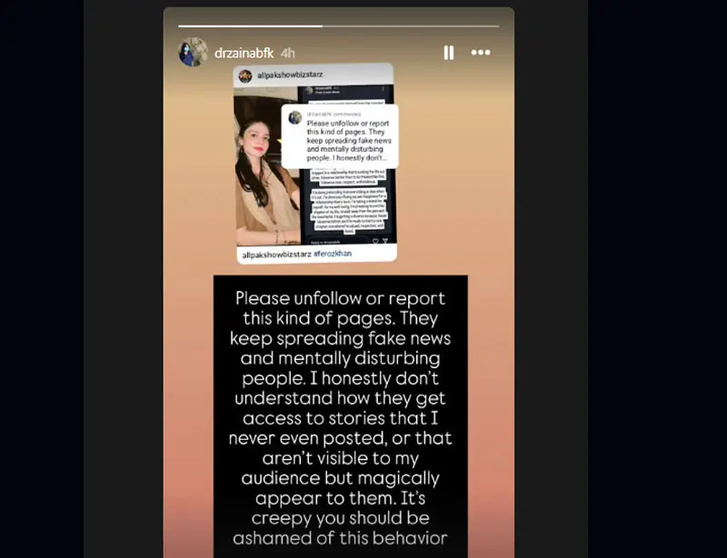 Dr Zainab shared a screenshot of a fake Instagram story that some pages claimed she had posted about her divorce. She said that she never shared such a story and it was not visible to her followers but somehow social media pages claimed to have seen it.