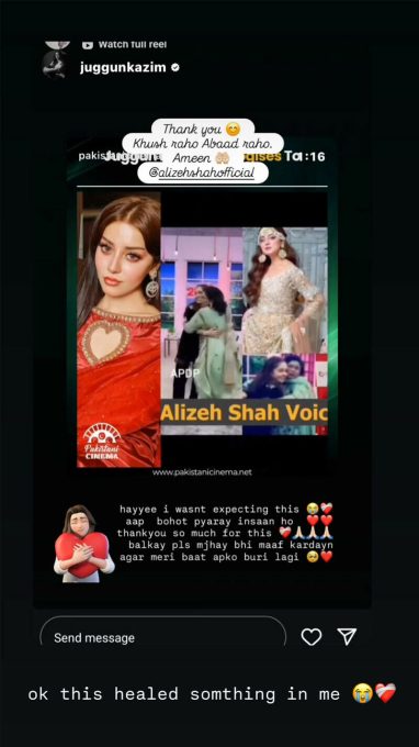 After Juggun Kazim apologized, Alizeh Shah posted a story on Instagram expressing surprise and thanking her.
