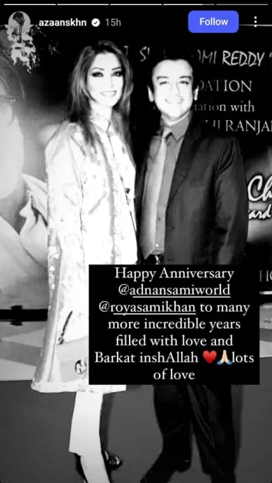 Azaan Sami Khan tagged his father and his wife in an Instagram story, writing, “Happy Anniversary, wishing you many more incredible years filled with love and blessings, Inshallah, lots of love.”