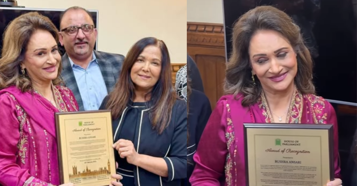 Bushra Ansari, a veteran Pakistani actress, was presented with the coveted Award of Recognition during a ceremony in the UK Parliament for her outstanding achievements to the entertainment business and social activism.