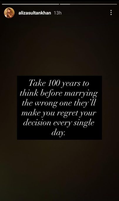 On Instagram, Alizeh shared a story telling girls that even if it takes a hundred years, think carefully before marrying the wrong person.