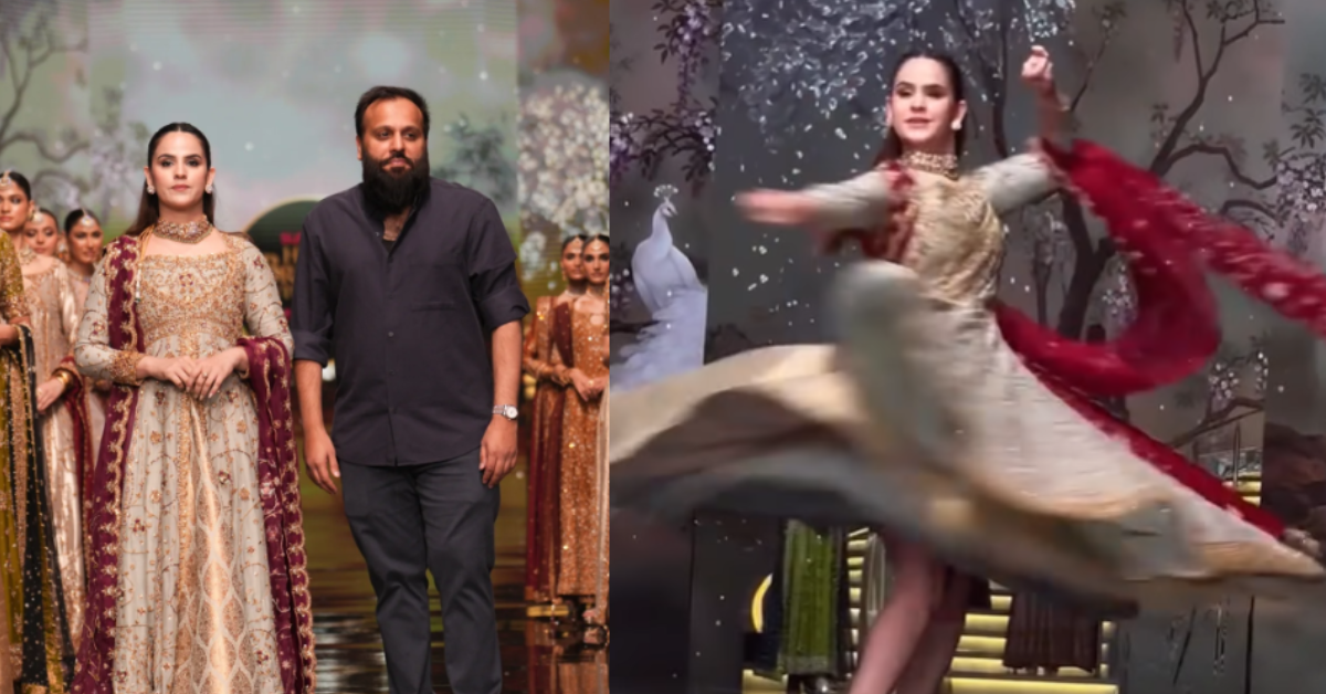 During the ramp walk, she performed a Kathak dance to the famous OST of the drama Ranjha Ranjha Kurdi, in which her Anarkali dress flutters in the air and her bare legs are visible.
