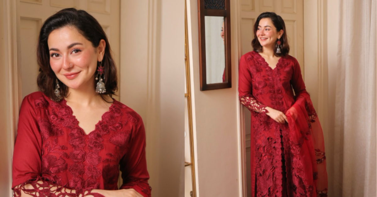 In the pictures shared by Hania Aamir, she is seen wearing a maroon front-open long shirt with matching trousers. The outfit features beautiful cutwork designs.