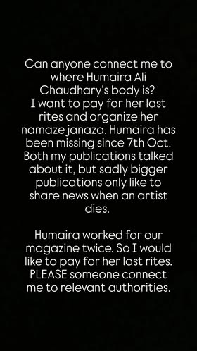 Danish Maqsood said that Humaira had been missing since October 7, and both of his publications raised their voice about it. But sadly, big media outlets only share such news when an artist passes away.