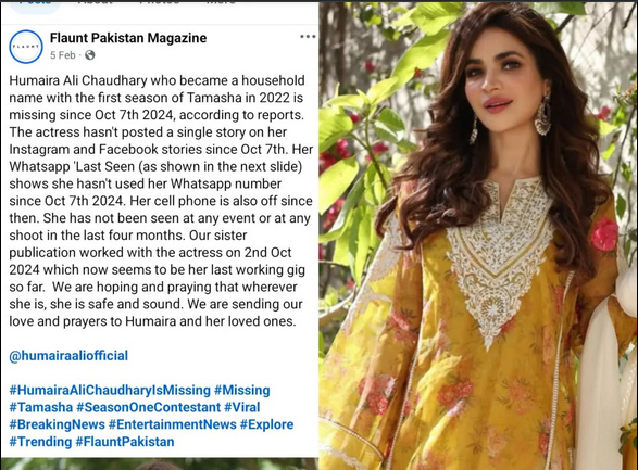 The post clearly stated that Humaira Ali Chaudhry, who became famous in 2022 from the first season of the reality show Tamasha, has been missing since October 7, 2024, as reported by various sources.