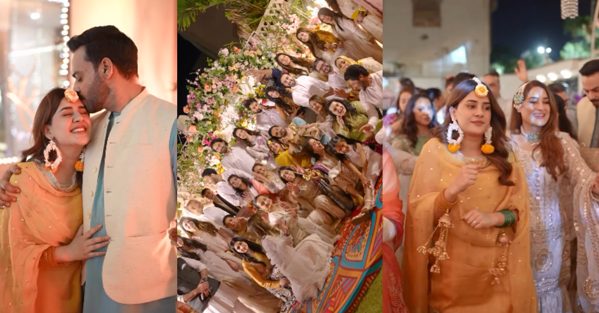 Kubra Khan and Gohar Rasheed uploaded a stunning HD video of their Mayun celebration today. Aisha Khan, Bilal Abbas Khan, Wajahat Rauf, Shazia Wajahat, Ali Safina, Hira Tareen, Momal Sheikh, Shahzad Sheikh, Ali Rehman Khan, and others all attended the Mayun celebration. Kubra Khan chose a solid yellow Mayun suit, while Gohar sported a turquoise Slalwar Qameez and an off-white waistcoat. Here are the photos: