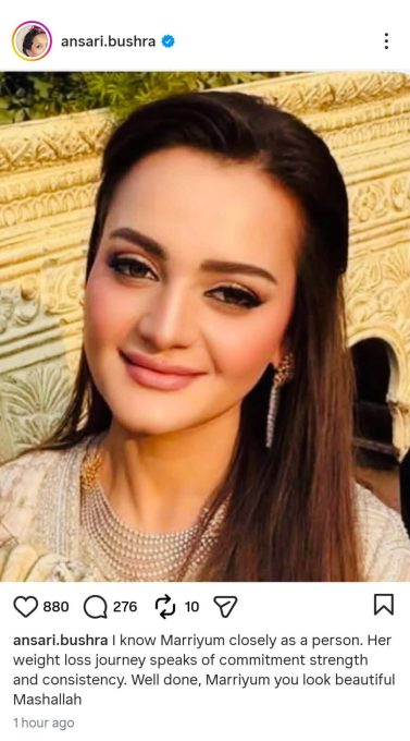 Bushra Ansari wrote in her comment on social media that I know Marriyum Aurangzeb closely; her weight loss journey is a testament to commitment and perseverance. Maryam, you look very beautiful, Masha Allah.