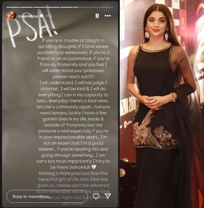 Mawra Hocane expressed sadness over Humaira Asghar’s tragic death and extended her support to those in the entertainment industry who may be struggling with mental health issues.