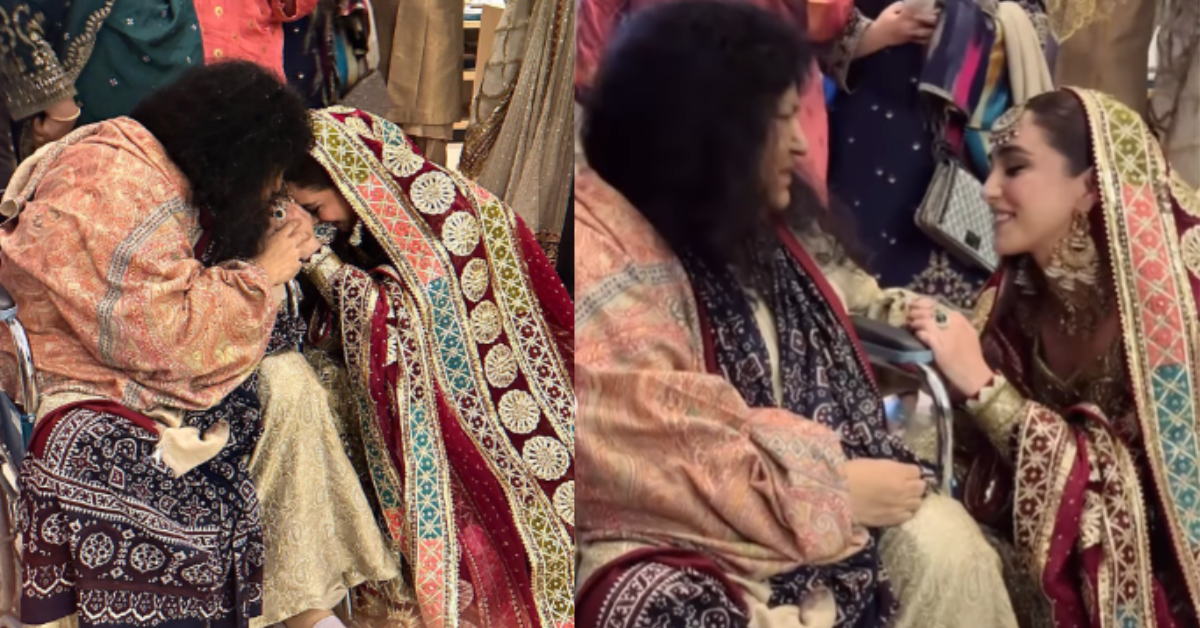 In the posted video, Maya Ali is dressed in a crimson bridal gown with heavy jewelry, while Abida Parveen is dressed simply with traditional Sindhi shawls and comfortable shoes.