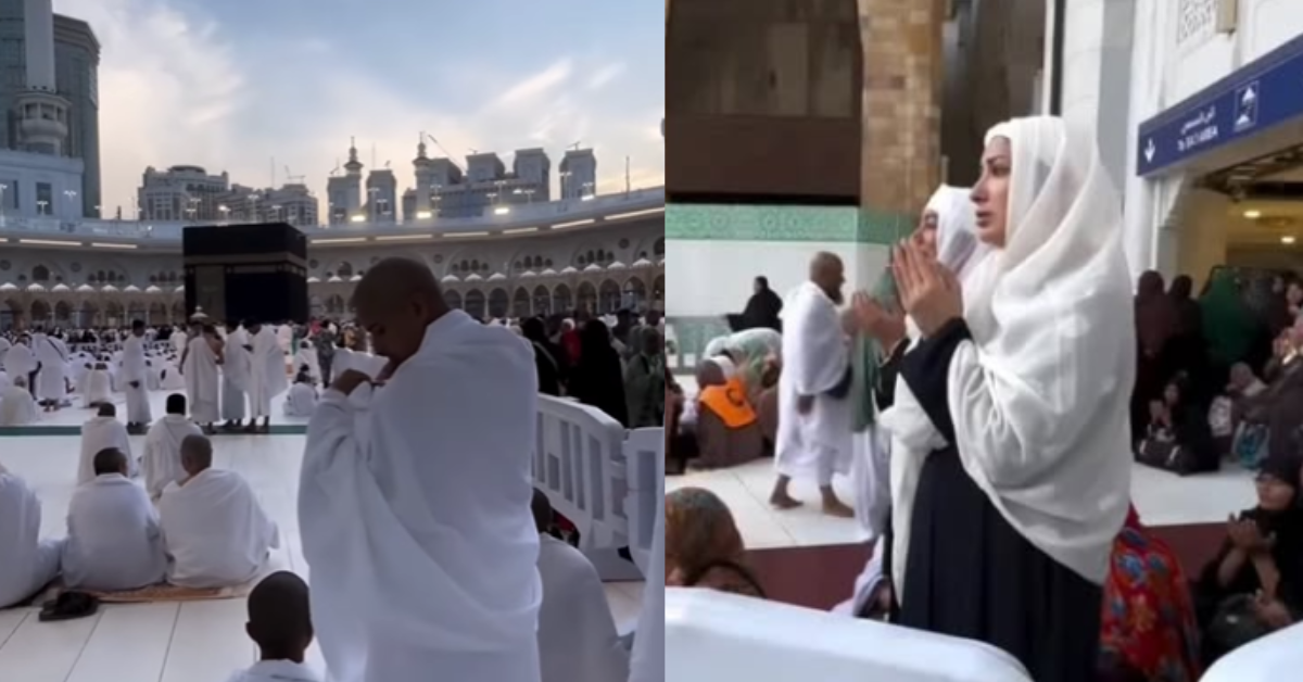 Mehwish Hayat is wearing a hijab and an abaya. She is seen praying while facing the Kaaba. Her mother, Rukhsar Hayat, is also with her.