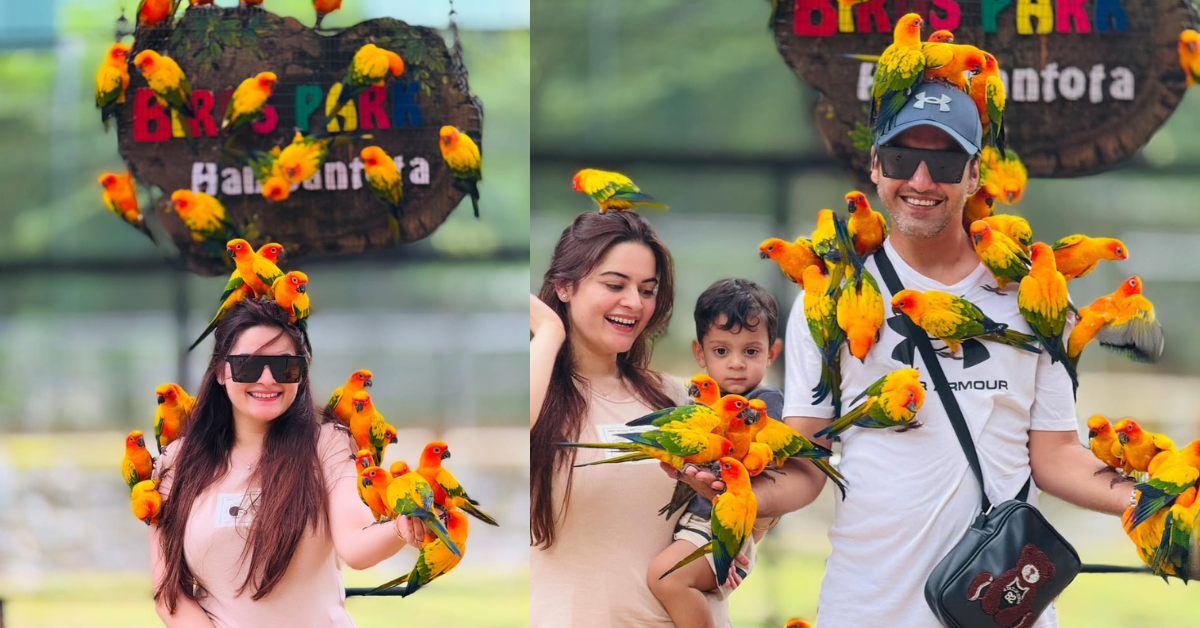 Pakistani actress Minal Khan shared pictures on social media where she is playing with parrots along with her husband Ahsan Mohsin Ikram and their son Hasan.