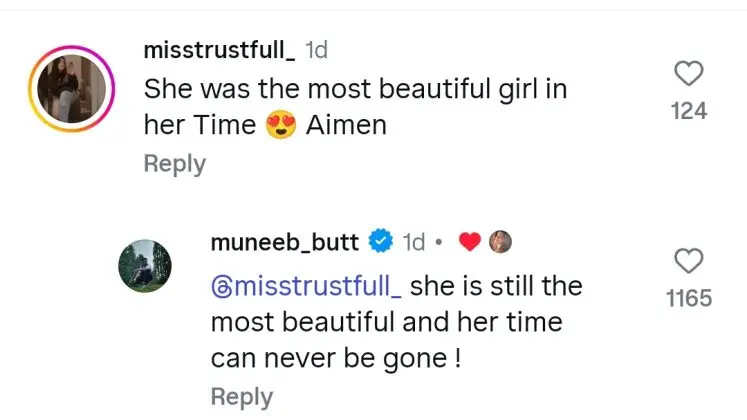 Instead of Aiman replying, Muneeb stepped in like a true supportive husband and showed his love by replying kindly. He wrote that she is still the most beautiful and her time can never be over.