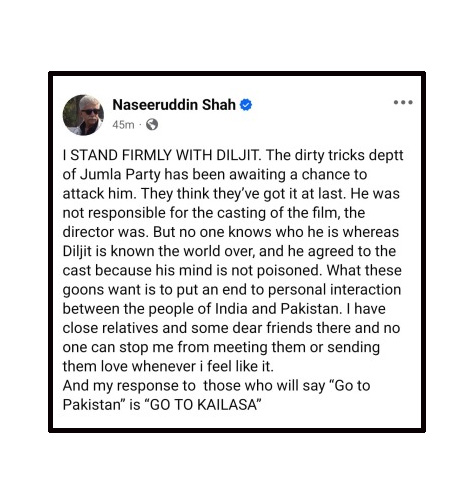 Naseeruddin Shah, in a Facebook post about Sardaar Ji 3, wrote: