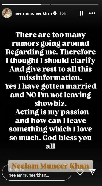 In her Instagram story, Neelam Muneer wrote, “There are many rumors circulating about me, so I thought I should clarify things to stop false news from spreading.”