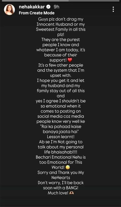 At the end of her message, Neha described herself as overly emotional, expressed her love for the fans and assured that she would soon return with renewed vigor. She also apologized and said that she was misunderstood.