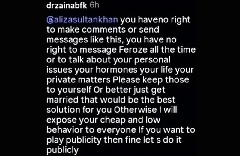 In another comment, Dr. Zainab addressed Aliza Sultan and wrote that she no longer has the right to contact Feroz Khan, send him messages, or bother him.