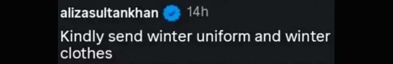 Feroz Khan’s ex-wife Aliza Sultan commented on an Instagram post that ‘Please send winter clothes and uniforms’.