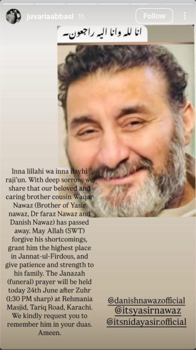 Actress Javeria Abbasi also expressed her sorrow over the death of Waqar Nawaz. She shared a story on Instagram and prayed for his forgiveness and a high place in Jannah. She also shared the funeral details and asked people to remember him in their prayers.