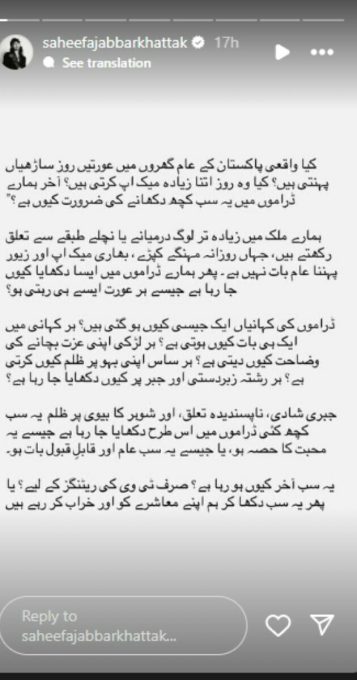 She questioned if women in Pakistani homes really wear sarees every day or do heavy makeup daily. She asked why dramas even show such things when most of the population belongs to the lower or middle class where expensive clothes are not a part of daily life.