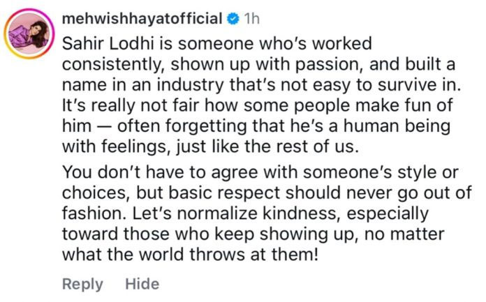 Mehwish Hayat spoke up in support of Sahir Lodhi, saying he is someone who has worked with dedication, moved forward with passion, and made a name for himself in an industry that is not easy. She said it’s unfair that people mock him and forget that he is also a human being with emotions, just like the rest of us.