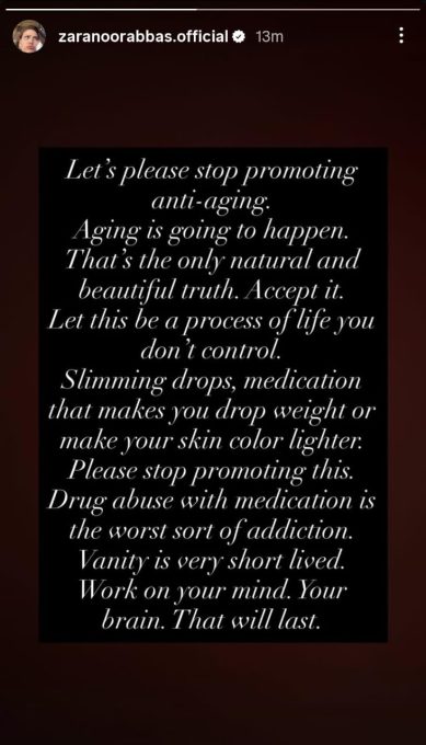 Zara shared a message on her Instagram story where she requested people to stop promoting anti-aging products.